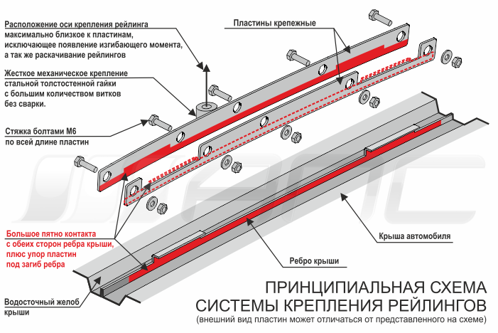 Способ установки рейлингов – Механическое крепление БЕЗ СВЕРЛЕНИЯ КРЫШИ! Для крепления рейлинга, под молдинги водостоков крыши устанавливаются крепежные пластины, которые надежно фиксируются к металлическому монтажному ребру автомобиля. Пластины полностью скрываются под молдингами в которых выполняются отверстия, по два с каждой стороны. Через полученные отверстия в молдингах Рейлинги прикручиваются винтами М6 в резьбу монтажных пластин.